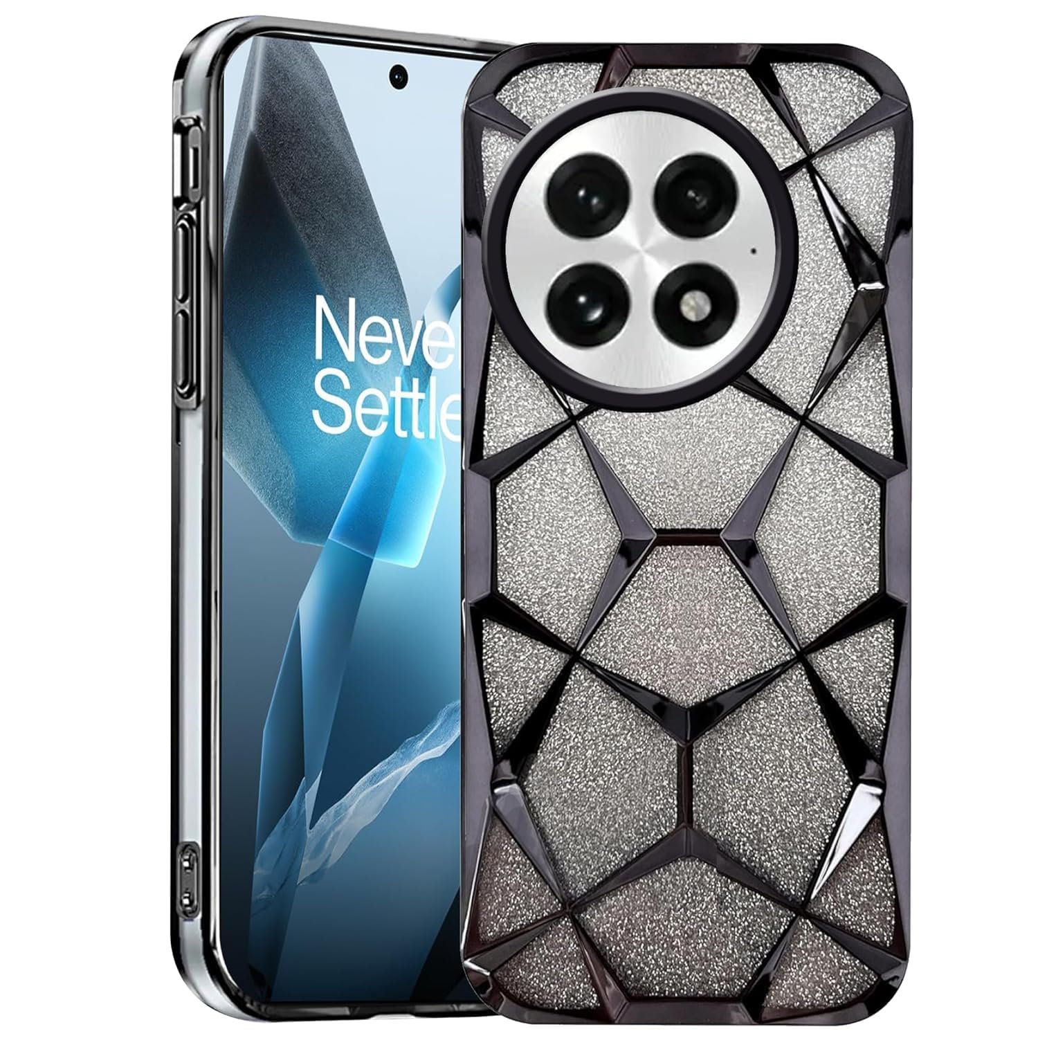 OnePlus 13R 5G Luxury Electroplated 3D Cube Diamond Bling Shiny Shockproof Stylish Design Slim Protective Back Cover for Girls & Women(Black)